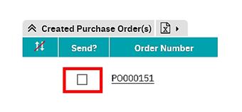 Each line in the grid represents a different purchase order. To send one or more purchase orders place a tick in the checkbox for that order in the ‘send’ column.