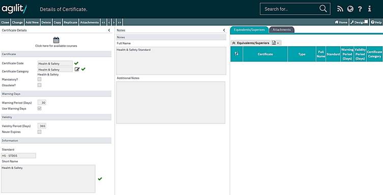 Against each definition multiple files can be attached, using the standard agility controls, here any associated certificate or course documentation, blank certificates, course details etc. can be stored.