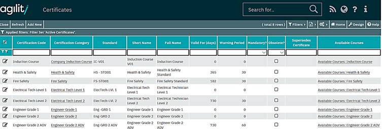 Each certificate definition also has an ‘Available Courses’ button that will display any forthcoming course that has been defined in Agility for the currently defined certification.