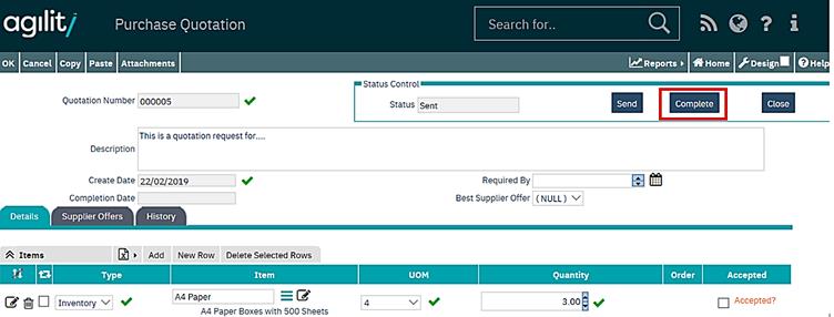 After this step is finished, there should be enough information in the quotation to be able to select the best offer and pass the quotation for acceptance. This can be done by clicking “Complete” button in the status control section of the form: