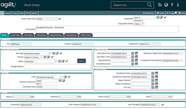 The work order detail form provides the most comprehensive options for data entry when completing the work order, as any aspect of the work order can be modified for all tasks. On opening the work order detail form, enter change mode by clicking on the change option in the menu bar.