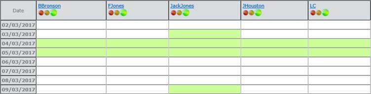 Within the scheduler grid, below each labour resource name is a ‘traffic light’. This indicates the availability of that labour resource.