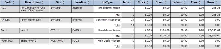 This report provides a tabular breakdown of equipment costs and downtime for each job type for a given date range.