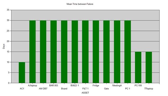 It can be seen from the MTBF chart that the item ‘AC1’ breaks down quite regularly, on average every ten days. However looking at this item on the ‘time to repair’ chart shows that it does not on average take long to repair and likewise using the ‘time to attend chart’ it can be seen that it doesn’t take long to get to the job.