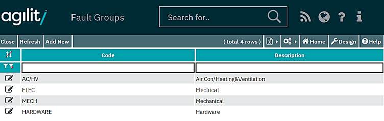 Accessed from Standing Data >> Work Orders >> Fault Groups