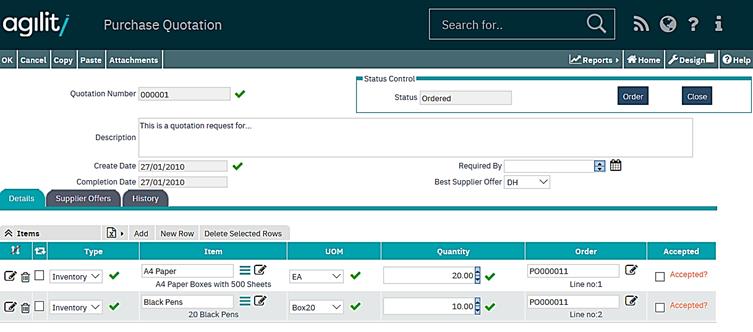 Initial purchase quotations are created in status “New”. In that status, all parts of the quotation can be modified.