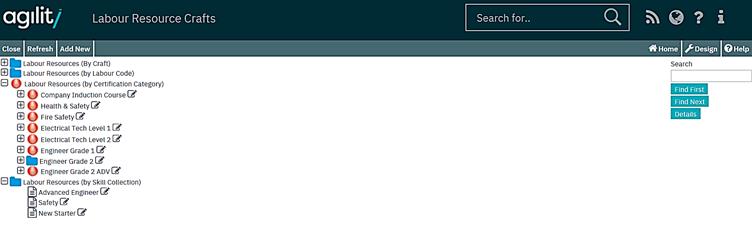The labour by craft view used as a look up when selecting labour resources has 2 new additional nodes. These organise labour resources by the valid (not expired) certification or skill collections currently held.