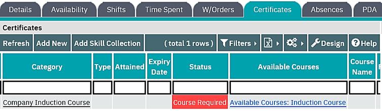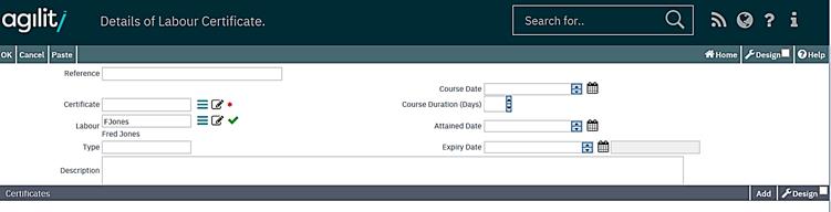 You will note that when adding an individual certificate as a new requirement the course details and certificate attained and expiry dates are blank. These will be automatically updated when the labour resource is booked on a training course and the certificate has been obtained.
