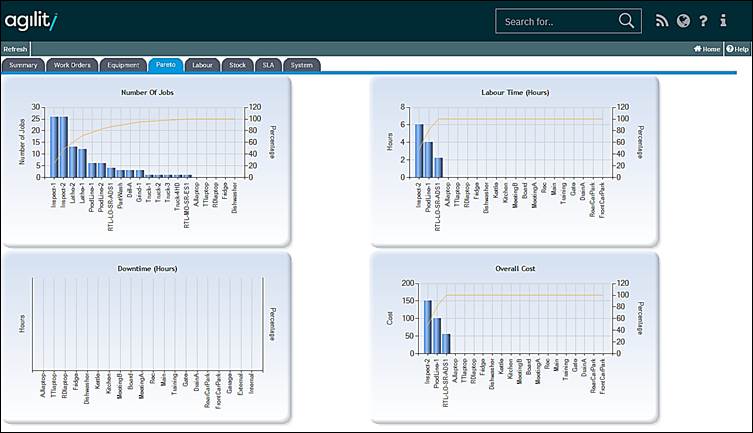 This tab plots the Pareto Analysis (80/20 rule) across four different charts displaying: