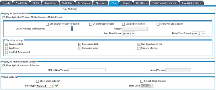 The settings in this tab are only applicable if Mobile Expert PDA software is being used by the Labour Resource.