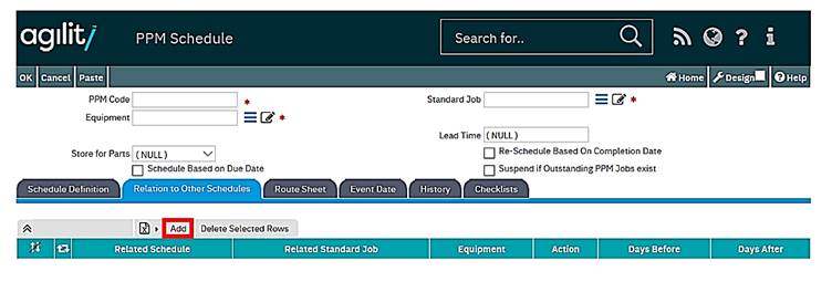 To suppress a scheduled work order, click on the Add button within the ‘Relationship to Other Schedules’ grid: