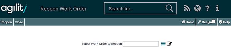 Once the form has been opened simply enter the work order number, or use the help to locate and select the required work order. Then click the ‘reopen’ option from the menu bar.