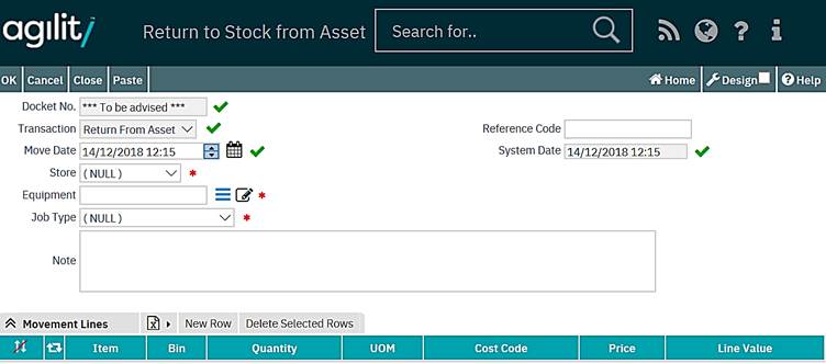This transaction is used to return items back into stock which have previously been issued against an Asset but not used. Create of Movement against Asset updates Asset costs . Items costs are removed from Asset Internal Material Costs.
