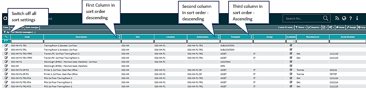 It is possible to apply sorts to more than one column, in which case the order in which the fields are being used is indicated by a number alongside the column heading.