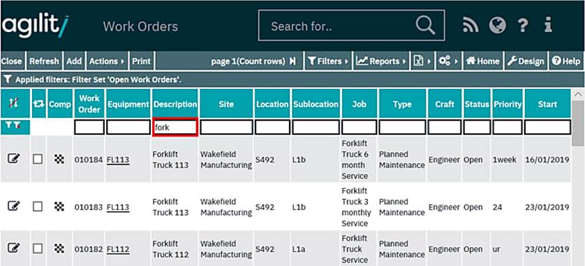For example, typing the word ‘Fork’ would return all of the work orders where the description starts with the word ‘Fork’.