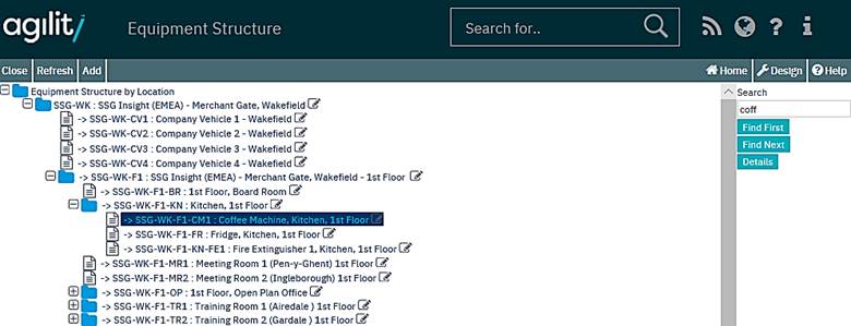 Tree View forms offer the functionality to search for records within the Tree Structure. This is a free text search facility, so will retrieve all records which contain the search string in the Tree Header Codes (in the example of the Asset Tree Structure this would search the Site Code, Location Code, Sub Location Code or Asset Code).
