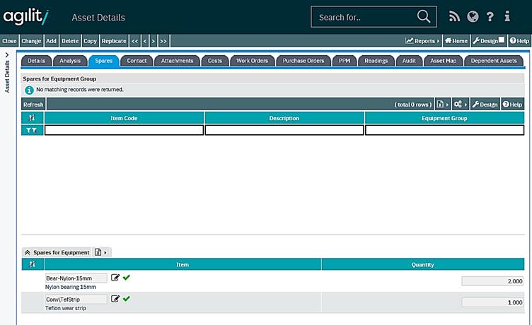 You can see in the screenshot above; the Spares tab has been selected and two Inventory items are displayed as Spare Parts for this asset.