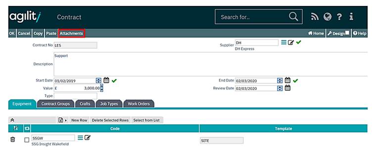Files can be attached to and stored with the contract. Attached files can also be automatically printed with any work order raised against the contract.