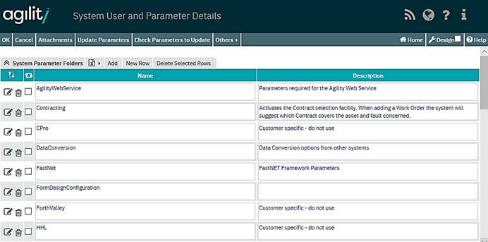 The table below contains detailed information about all system parameters utilised by Agility.