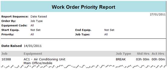 This is a work order listing report that returns work orders sorted and grouped by either priority or date dependant on the report type selected at runtime.