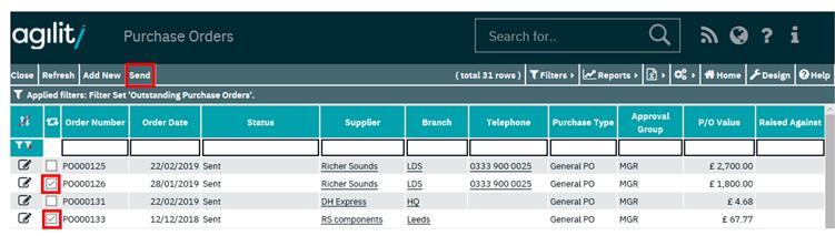 An individual purchase order can be sent from the purchase order detail screen or multiple purchase orders can be sent from the purchase order scan form.
