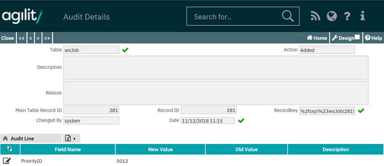 An audit log is created each time an audited field is changed. This is recorded in the syAudit and syAuditLine tables. The following information is logged: