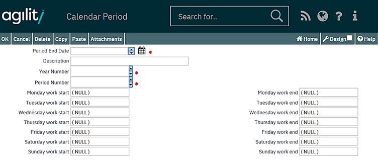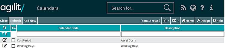 A calendar is made up of periods that detail an end date and optionally working days and hours. It is advisable to have only one calendar in the system and to add new periods when required. If a calendar period does not exist i.e. it has expired, when completing Work Orders with attached costs, then completion cannot take place.