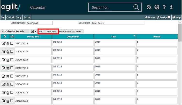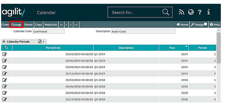 Click on the magnifying glass icon to the left of an existing definition to view the calendar detail this will provide a scan view of all the periods configured against the selected calendar.