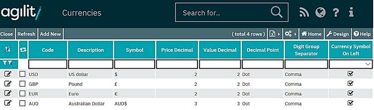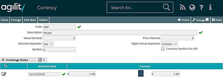 Definition of used currencies and exchange rates can be specified within Agility system.