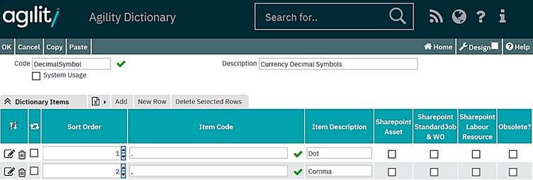 These fields describe what sign should be used to separate decimals or group of digits (thousand etc.). Values displayed in these combo box fields can be defined in system dictionaries: Currency Decimal Symbols and