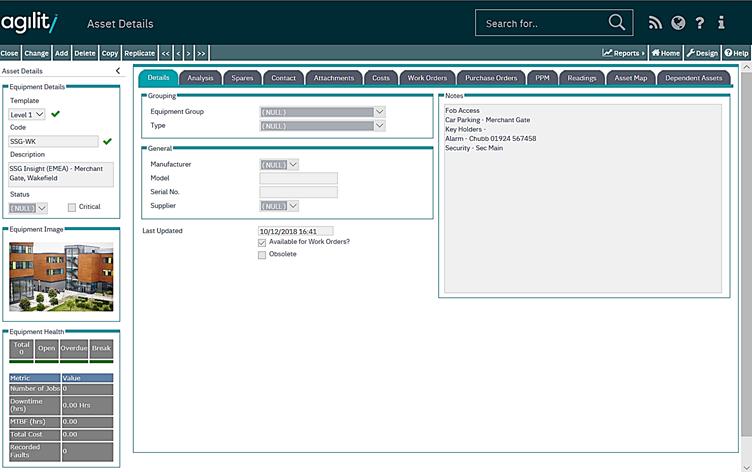 When enquiring on existing equipment, the following additional tab folders will be available: Spares, Costs, Work Orders, PPM Schedules.