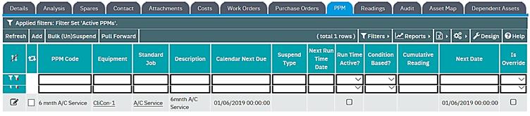 The PPM Schedules grid will display any planned maintenance jobs that have been created against the selected equipment. “Add” button on the grid can be used to add a new planned maintenance job.