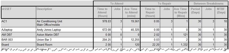 It can be seen from the MTBF chart that the item ‘AC1’ breaks down quite regularly, on average every ten days. However looking at this item on the ‘time to repair’ chart shows that it does not on average take long to repair and likewise using the ‘time to attend chart’ it can be seen that it doesn’t take long to get to the job.