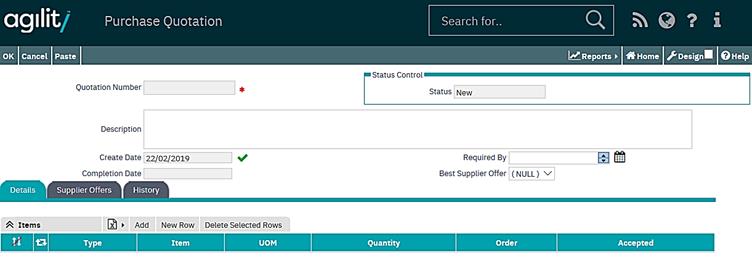 Initial purchase quotations are created in status “New”. In that status, all parts of the quotation can be modified.