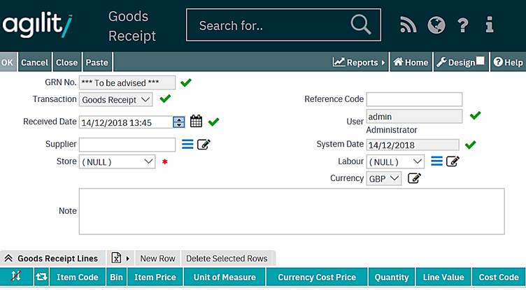 This transaction is used for receiving items which have not been ordered using the Purchase Order functionality within Agility.