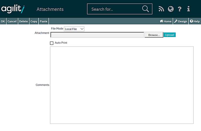 Select ‘local file’ if the document is stored or accessed from the local PC on which the session of Agility is running, a browse option is then displayed to select the appropriate document. Navigate to the file, in the same manner as opening any file in windows, click on ‘Open’ and the file path and name will be entered onto the form.