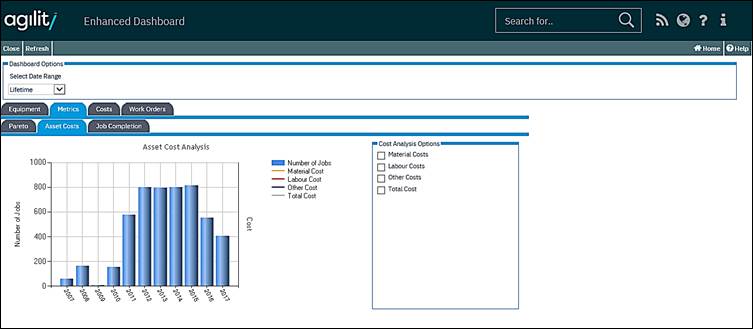 As the name suggests, this is focused on the costs associated with your assets. The columns represent number of Work Orders raised (using the scale on the left of the chart), and on the right-hand side there are four tick boxes. These allow you to overlay line charts representing: