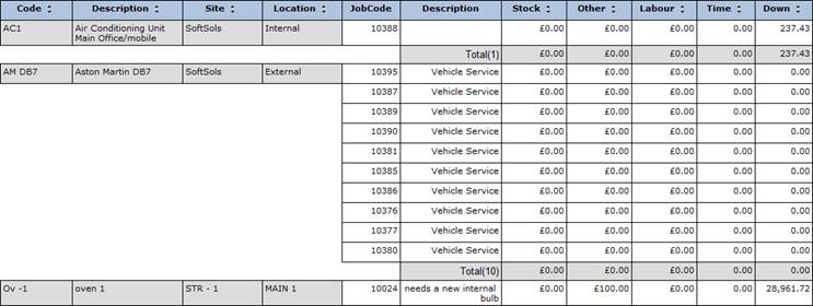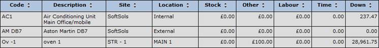 This report returns a tabular list of equipment items showing figures for all work orders raised against an equipment item that meet the filter criteria.