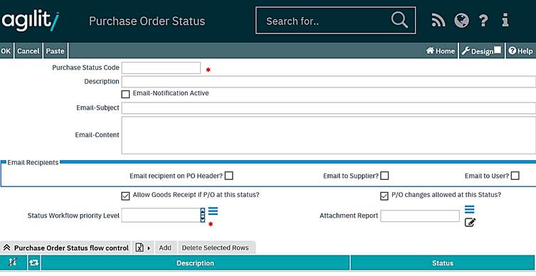 The Purchase Status Code is free text and is a unique identifier for the Purchase Order Status. This must be populated.