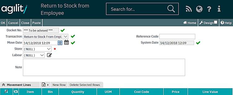 This transaction is used return items back into stock which have previously been issued against an Employee but not used.