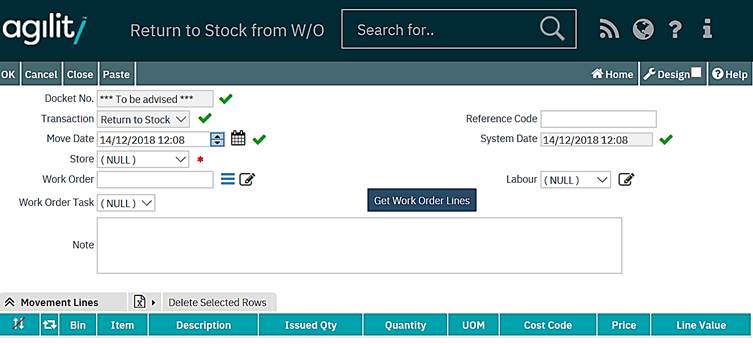 This transaction is used return items back into stock which have previously been issued against a Work Order but not used.
