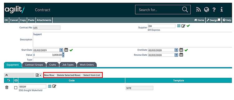 The items in the equipment, contract groups, crafts and job type tabs can be added and removed by using the new, delete and select from list option available on each grid within each tab.
