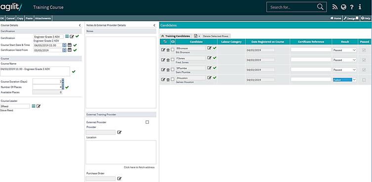 When the course has been run the results can be updated from the course detail form for each candidate.