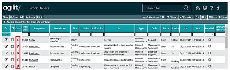 The work order completion form can be accessed from the majority of scan forms by clicking the ‘chequered flag icon on the same row as the required work order.