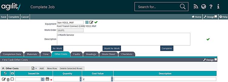 When the completion form opens the top portion of the form contains pre-populated work order data. The lower portion contains a series of tabs for the recording of transactions against the first or main task on the work order.
