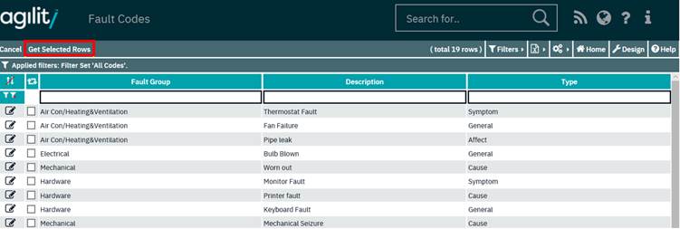 To add faults click the select from list option. This will open a multi select grid of available faults that can be selected. Click the check box of the fault(s) that need to be added to the work order using the selection check boxes.