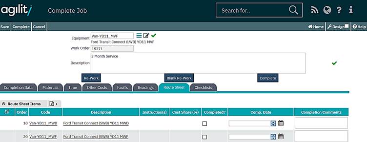 The completion data tab contains the main completion data about the job, times, comments and breakdown details if the work order was of a break down job type.