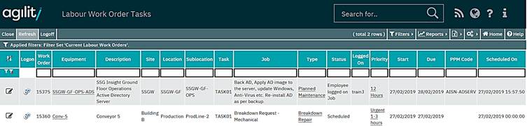 Work Order Logon/Logoff functions are provided to easily mark the Work Order and task the employee is currently working on. Once the Work Order or task is completed or suspended, employee can easily log off the currently assigned Work Order. Logon/Logoff automatically creates a labour transaction record and calculates the cost based on the time between logon and logoff actions.