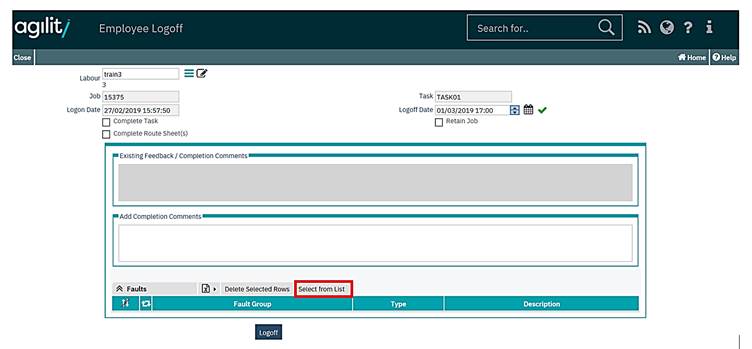 If any selected faults need to be removed from the grid. They can either be removed at this stage by clicking the check box on the unrequired row and clicking the delete selected rows button, prior to clicking the ‘Log Off’ button. Or they can be removed from the work order later.